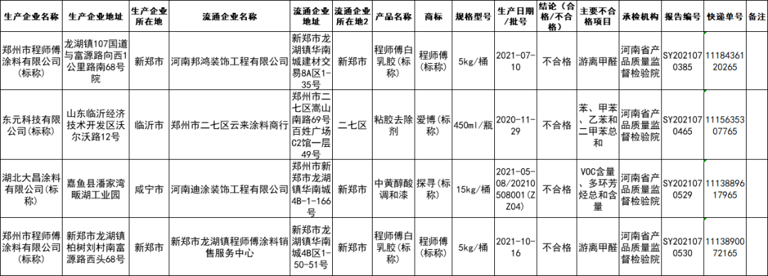 湖北大昌涂料有限公司生产的中黄醇酸调和漆,商标:探寻(标称),规格型号:15kg/桶,生产日期批号:2021-05-08/20210508001(ZZ04),VOC含量、多环芳烃总和含量不合格。另有三家企业的白乳胶和粘胶去除剂质量不合格。